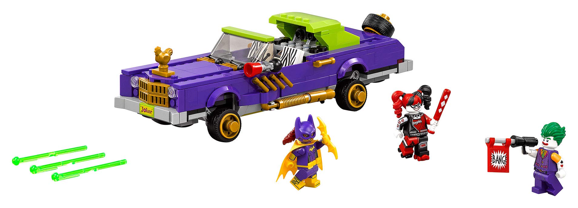- The Notorious Lowrider features a minifigure cockpit with stereo element, bouncing suspension function, opening trunk with hidden double spring-loaded shooters and storage space, handles for Harley Quinn to hang onto, golden-colored chicken ornament on the hood, spare wheel and a comedy horn.